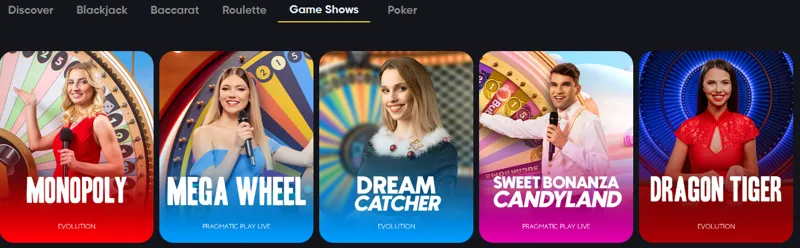 Dessa live game shows och kortspel erbjuder en mix av snabba spel och interaktiva upplevelser där spelare kan njuta av både lyckohjul och kortspel i en social miljö med livevärdar